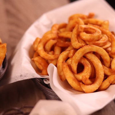 400g of chips curly fries fried, its enough for 2 served with dip of ketchup