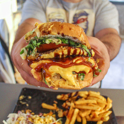 double beef patty charcoal grilled served in soft burger bun, lettuce, tomato, onion, hot melted cheddar a side fries and coleslaw salad.
