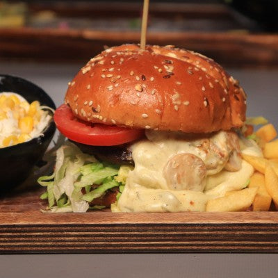 130g of homemade beef burger mix, charcoal grilled, serving in soft burger bun, lettuce, onion and mix of creamy cooked fresh mushroom with rosemary and mozarella cheese, a side fries and coleslaw salad