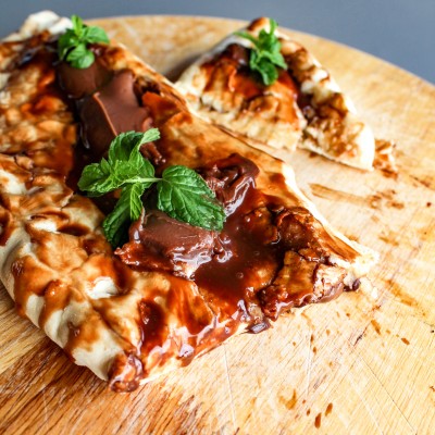 Oven-baked folded pizza filled with Nutella chocolate spread and nuts