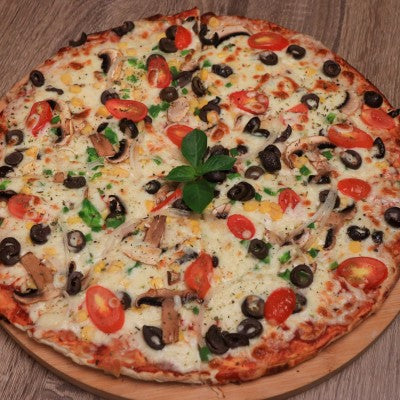 Pizza dough, homemade pizza sauce, fresh mushroom, corn, green pepper, black olives, cherry tomato, mozzarella cheese, topped with fresh basil
